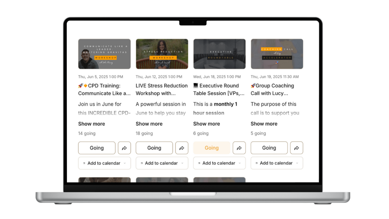 Head straight to the EVENTS tab to check what’s coming up and RSVP, so you never miss out on connection, coaching, and community. Your next-level leadership starts here.